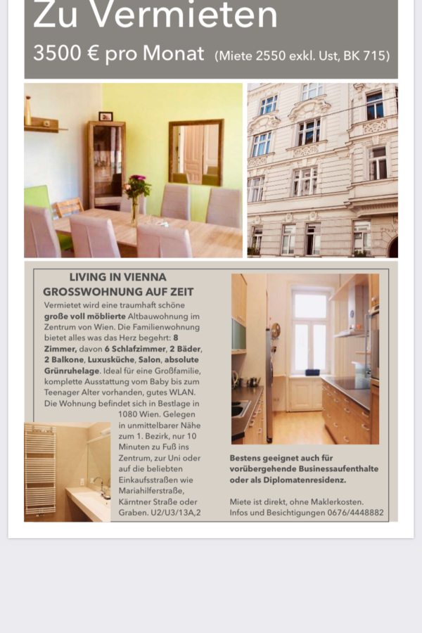 Beautiful apartement in the centre of Vienna for rent. The flat offers all the heart desires on more than 220 m2: 8 rooms, 2 bathrooms, 2 balconies, garden view and walking distance into the city. Ideal location for a large family or business team.